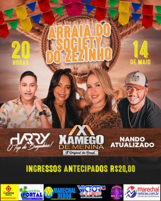 Depois do sucesso de público que foram os shows das bandas Arroba Mix, Rochedos e Karisma, vem aí mais um grande evento que promete agitar a cidade de Marechal Deodoro e região: ARRAIÁ DO SOCIETY DO ZEZINHO.