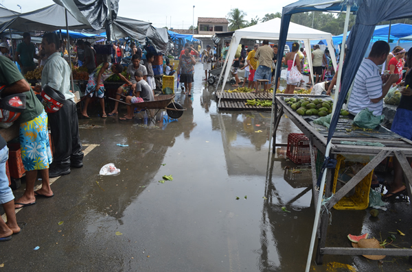 De acordo com o senhor Cláudio, um dos feirantes que conversou conosco, o ponto dele no pátio da feira está alagado, o que o obrigou a mudar de lugar.