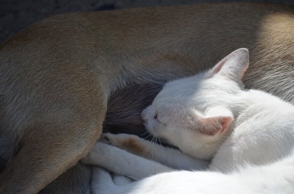 Até pareciam bons amigos, principalmente porque quando nos aproximamos para registrar a cena, a cachorra tentou defender o gato como se fosse da sua prole.
