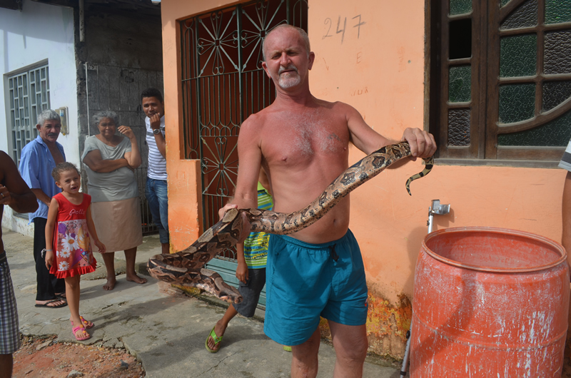 Moradores da Rua da Praia, centro histórico da cidade de Marechal Deodoro, encontraram na tarde deste domingo (13), uma cobra jibóia.
