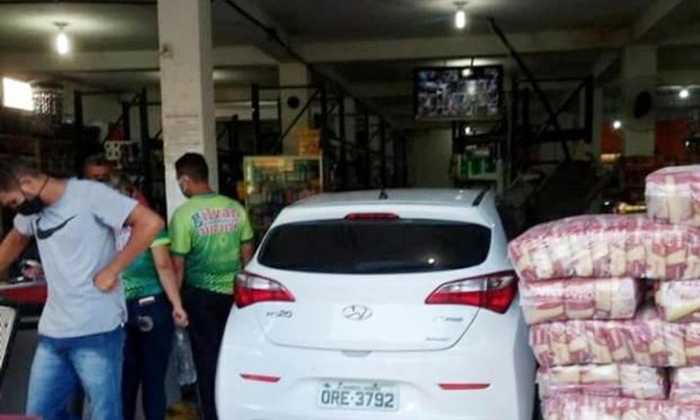 O veículo chegou a atingir um balcão de atendimento (caixa) do supermercado e derrubar gôndolas e alguns produtos, como cervejas e latas de leite.
