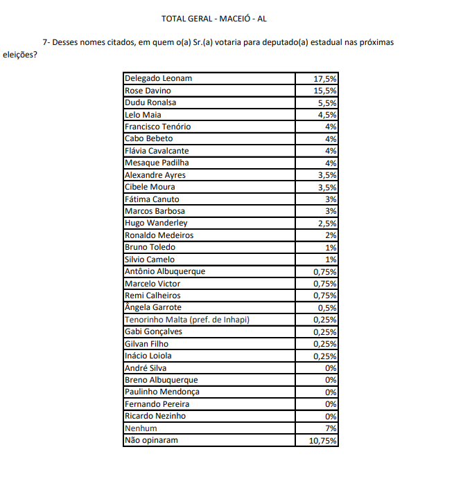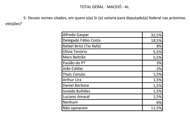Além das intenções de votos para Governo de Alagoas e Senado, a pesquisa do Instituto Falpe, realizada entre os dias 9 e 13 deste mês, em todos os bairros de Maceió, questionou os eleitores também sobre alguns possíveis nomes para a Câmara dos Deputados e para Assembleia Legislativa de Alagoas.