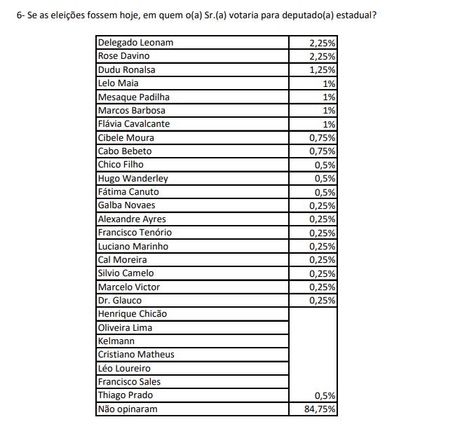 Na segunda pergunta – espontânea (quando não são apresentados nomes aos entrevistados) – ao serem questionados sobre, em quem votariam para deputado estadual se as eleições fossem hoje, a maioria (84,75%) não opinou. As respostas totais foram: