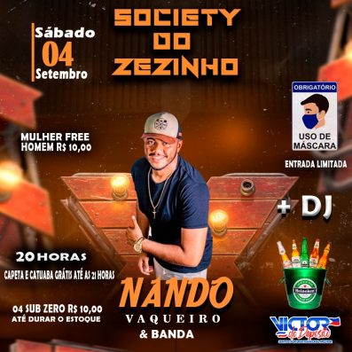 Na semana em que o governo do estado de Alagoas publicou um novo Decreto flexibilizando os eventos, o Society do Zezinho que fica na Rua Pergentina Pedrosa, em Taperaguá, reabrirá as portas como o retorno dos eventos musicais. Quem se apresenta na noite deste sábado, dia 04, a partir das 20h, é o cantor Nando Vaqueiro.