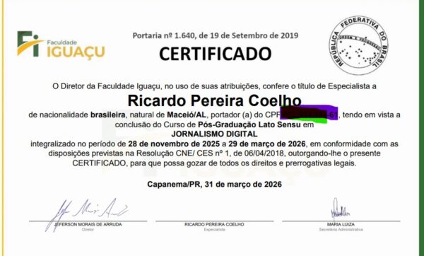 Vivemos em uma era onde “a sua comunicação fala, mas a sua linguagem corporal decide se acreditam em você”. No entanto, no ambiente vasto e veloz da internet, essa presença precisa de ferramentas técnicas e éticas para se manter sólida. É por isso que hoje compartilho com vocês uma etapa fundamental da minha trajetória: a conclusão da minha Pós-Graduação em Jornalismo Digital pela Faculdade Iguaçu.