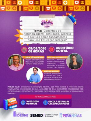 O ano letivo de 2026 começou com entusiasmo e compromisso com a qualidade da educação no município de Piranhas, a partir da realização da Jornada Pedagógica 2026, promovida em parceria com o Instituto de Desenvolvimento Educacional e Social do Nordeste (IDESNE). Com o tema “Caminhos de Aprendizagem: Identidade, Ciência e Cultura como fundamentos para uma Educação Integral”, o encontro reafirmou a importância de uma educação humanizada, inclusiva e alinhada às realidades locais.