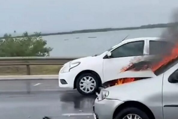 Um automóvel foi destruído após pegar fogo na manhã desta terça-feira (17) sobre a Ponte Divaldo Suruagy, importante via de ligação entre Maceió e Marechal Deodoro.