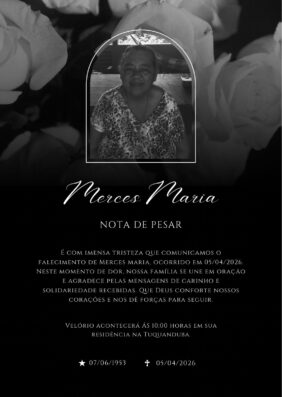 É com imenso pesar que os familiares de Mercês Maria, comunicam o seu falecimento, ocorrido na madrugada deste domingo (05/04), em decorrência de problemas clínicos.