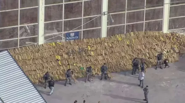 A retirada do entorpecente mobilizou dezenas de agentes por cerca de cinco horas e exigiu o uso de quatro caminhões, cada um com capacidade para cinco toneladas, para retirar a droga do local.