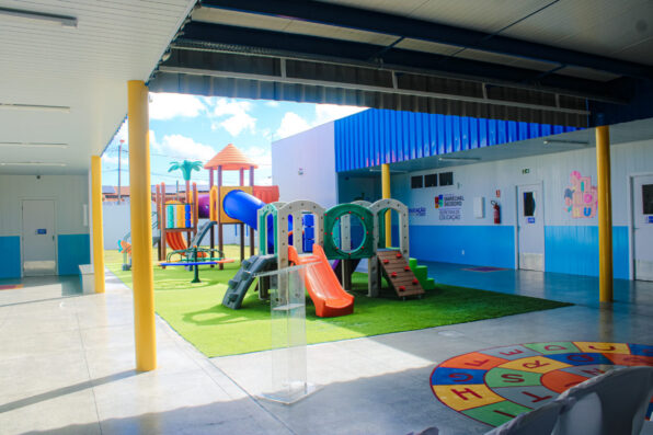 Com quase 900m² de área construída, a creche foi planejada para atender mais de 200 crianças. O espaço conta com estrutura acessível, com rampas, pisos táteis e ambientes adaptados para o berçário, além de iluminação em LED, garantindo mais conforto e eficiência.