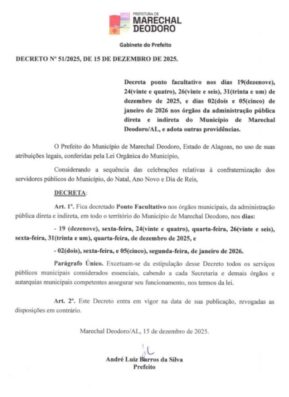 A Prefeitura Municipal de Marechal Deodoro/AL, anunciou através do Decreto Nº 51/2025, datado do último dia 15/12, os pontos facultativos no período que compreende entre está próxima sexta-feira (19/12) e o início de janeiro (05/01/2026). Confira quais são: