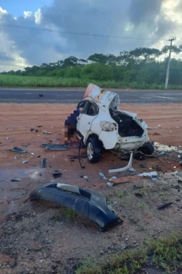 O impacto foi tão violento que o Kwid ficou completamente destruído, com destroços espalhados pela pista e marcas de sangue ao redor do veículo. A vítima, que seguia sozinha, foi parcialmente projetada para fora do carro e morreu no local. O Instituto de Criminalística (IC) e o Instituto Médico Legal (IML) foram acionados para a perícia e recolhimento do corpo.