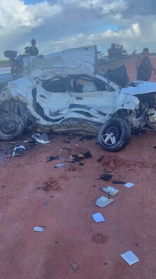 De acordo com as informações, um veículo de passeio modelo Renault Kwid de cor branca, colidiu frontalmente com uma carreta que transportava pedras de granito. Com o impacto, o automóvel de menor porte ficou totalmente destruído.