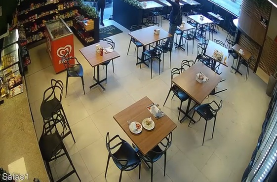 Durante a ação, a criança se assusta e corre em direção aos funcionários do estabelecimento. Enquanto isso, o policial tenta impedir que o suspeito pegue sua arma, mas, após alguns minutos de confronto, o agressor consegue desarmá-lo.